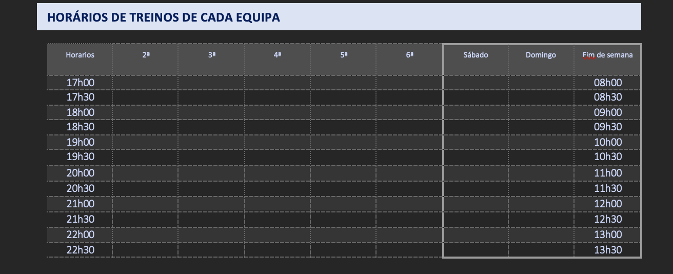 10. HORÁRIOS DE TREINO DE CADA EQUIPA