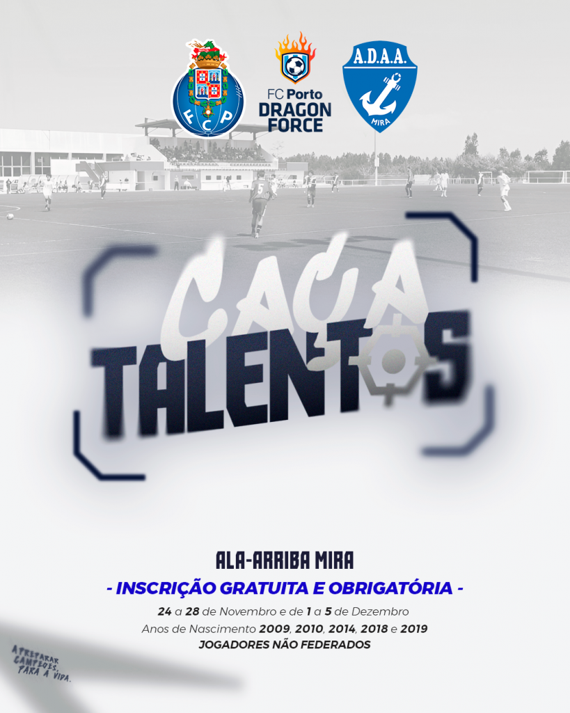 Sessão de treino com jogo, aberta a todos os jogadores não federados, nascidos em 2009, 2010, 2014, 2018 e 2019 e que querem candidatar-se a um lugar no plantel de uma equipa de competição da Escola de Futebol Dragon Force Ala-Arriba Mira.